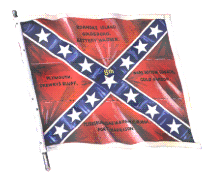 Bei dem Kampf um Plymouth verlor die 8th ca. 32% der Männer und den Flaggenträger F.J. Perkins wurde getötet. Bei Fort Harrison betrugen die Ausfälle innerhalb von 20 Minuten, 85% der noch 175 involvierten Männer. Der Flaggenträger J.R. Barnhardt fand, dass er einer Gefangenschaft nicht entgehen könnte und zerriss die alte Flagge, die so lange im Dienst war, in Stücke, um sie davor zu beschützen, in Hände des Feindes zu fallen.
